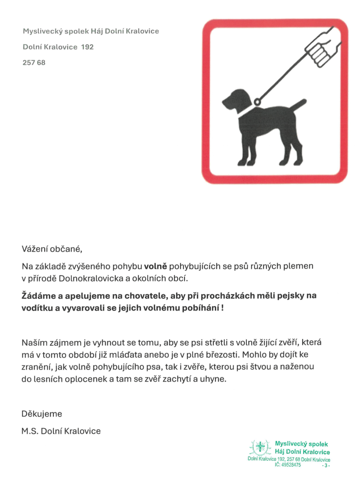 Myslivecký spolek Háj Dolní Kralovice vyzývá občany, aby při procházkách se psy dbali na jejich vodítko. V přírodě Dolnokralovicka se zvyšuje pohyb psů, což může ohrozit volně žijící zvěř, která má mláďata. Apelujeme na zodpovědnost chovatelů.